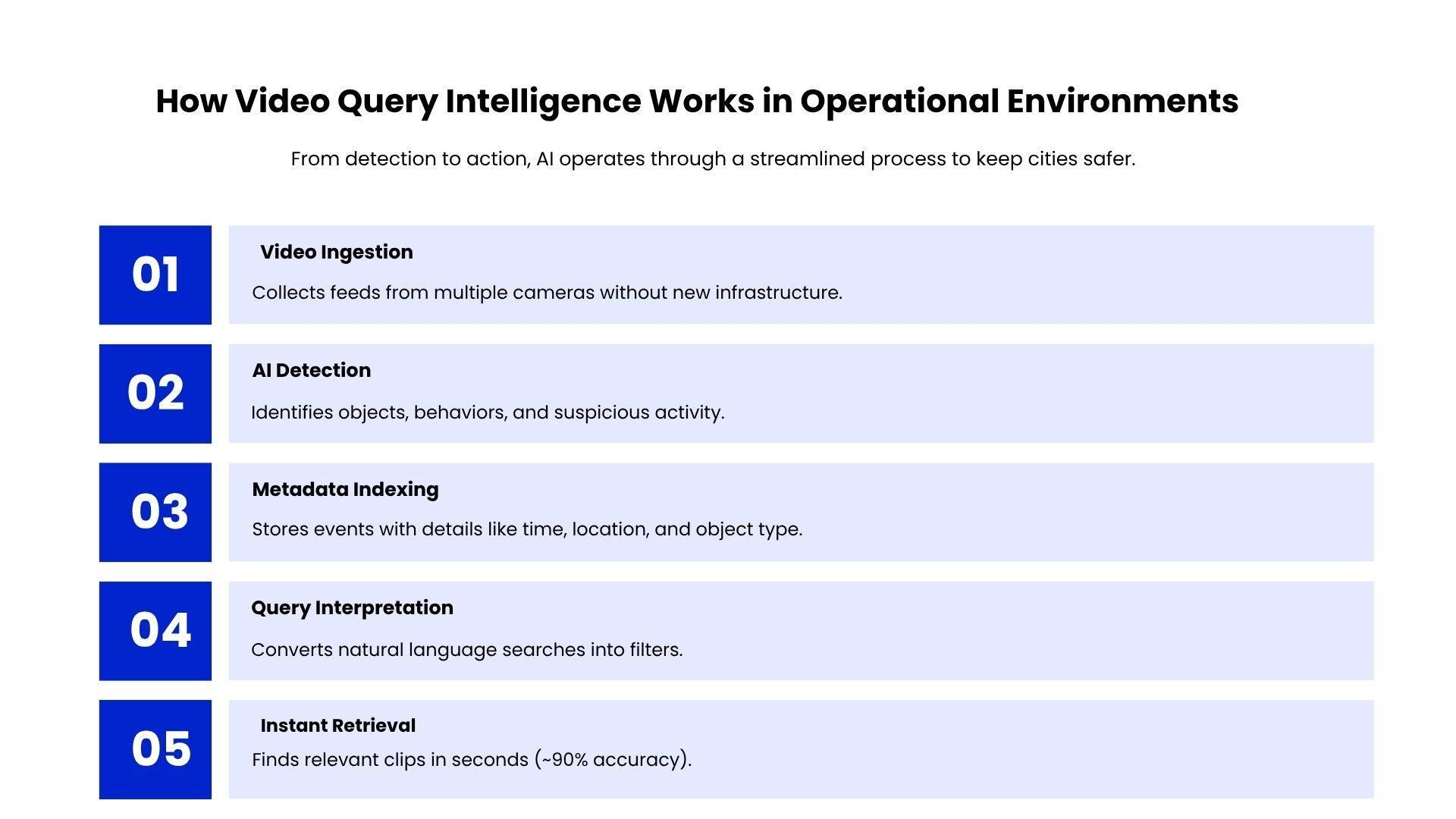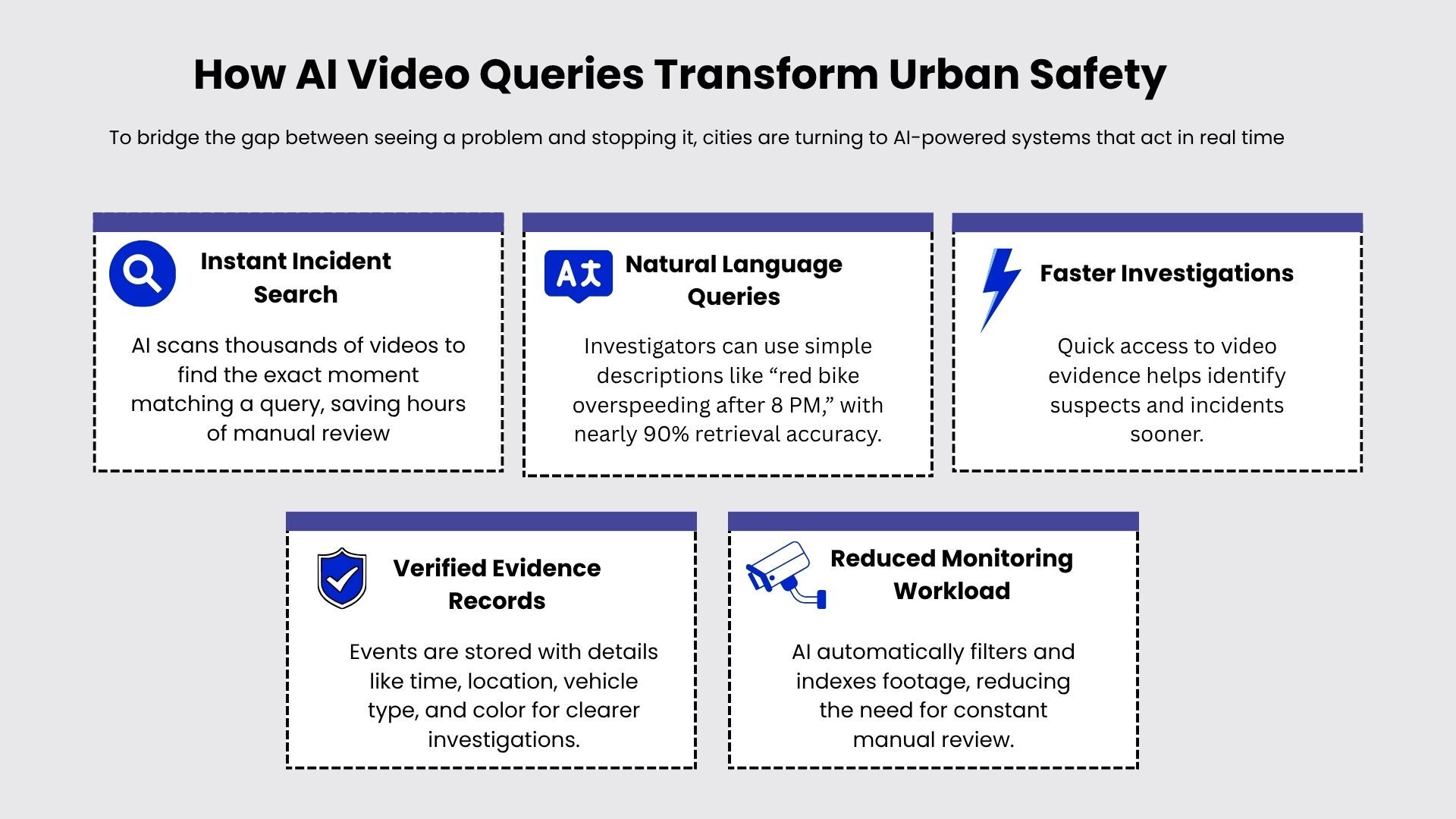 AI-enabled video query systems help address this challenge by allowing rapid search and analysis across large video datasets. By retrieving relevant footage within seconds, these systems support faster investigations, improved transparency, and quicker response to incidents, enabling more effective urban safety management