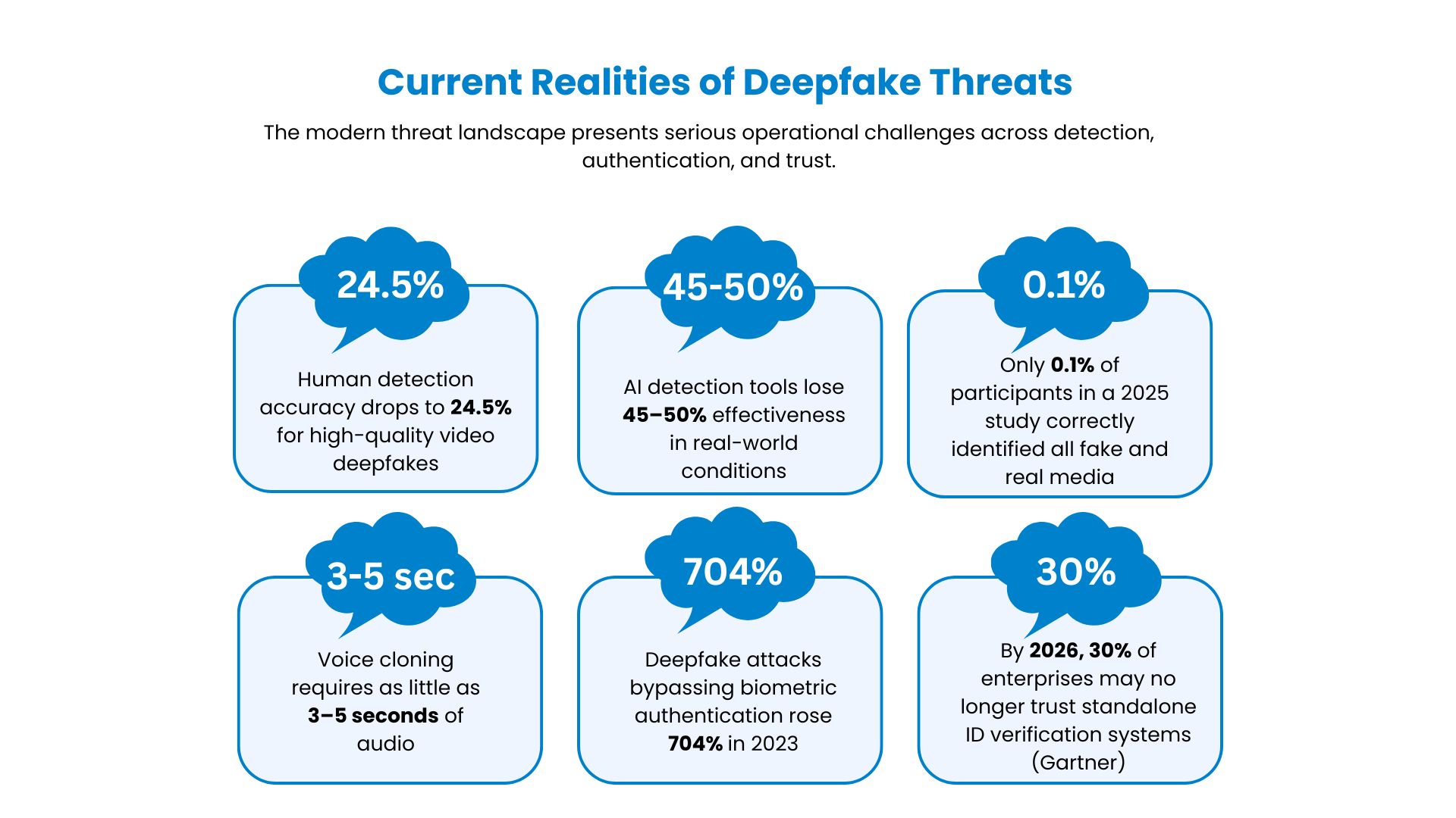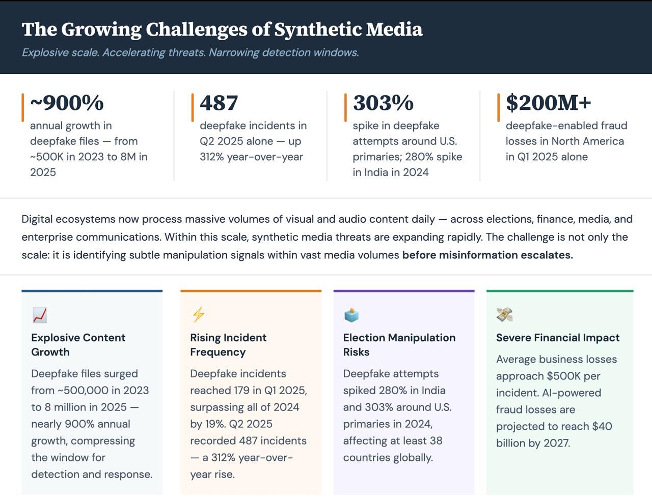 Digital ecosystems now process massive volumes of visual and audio content daily across elections, finance, media, and enterprise communications. Within this scale, synthetic media threats are expanding rapidly.